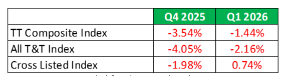 While the major indices continued to trend downward, the pace of decline slowed noticeably in the first quarter of 2026, with losses easing to roughly half the rate recorded in the previous quarter. The All T&T Index led the declines, falling by 2.16% for the quarter, compared to a sharper decline of 3.54% in the fourth quarter of 2025. Similarly, the TT Composite Index declined by 2.16%, an improvement from the 4.05% drop recorded in the prior quarter. The Cross-Listed index was the sole index to end the quarter in positive territory, up 0.74% in Q1 2026 after declining over three consecutive quarters.